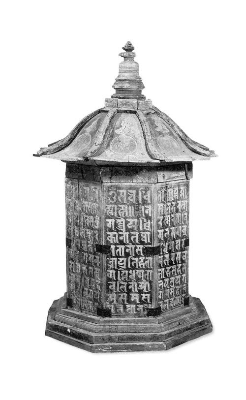 西夏木緣塔為西夏墓葬中第一次發(fā)現的西夏葬器。該塔通高75厘米,塔頂邊沿寬47厘米,呈四層八角形,飾紅色;分塔座、塔身、塔頂和塔剎四部分。塔座為四級八邊臺階。塔身為八邊柱體形,由長34厘米、寬12.5厘米、厚2厘米的八塊木板合成,表面涂藍色,每邊有黃色工整梵文“陀羅尼”,并用漢文注明陀羅尼經名。塔頂為傘式八邊形,每邊彩繪云氣紋和一個梵文字,內有墨書“故考任西經略司都案劉德仁,壽六旬有八,于天慶五年歲次戊午四月十六日亡歿,至天慶七年歲次庚辰(申)口夏十五日建緣塔,至中秋十三日入課訖”。塔剎圍欄為八邊形,其他相輪、覆缽、剎頂都是圓形,由下向上收分;底座周圍繪有卷草紋。