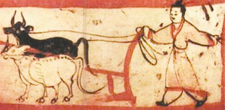 此后,在酒泉丁家閘十六國墓壁畫中就只有一牛牽引的雙轅犁了。說明魏晉時期是中國從二牛單轅犁過渡到一牛挽拉雙轅犁的時代,這一過渡的狀況及特點出現在嘉峪關地主墓葬壁畫中,又說明甘肅是這一重大農技改革的地區(qū)之一。