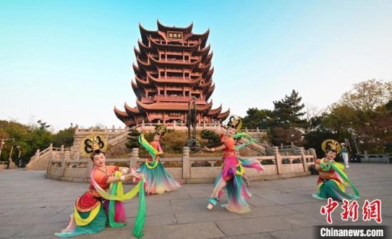 11月27日,伴著幽幽古樂(lè),“飛天仙子”在“江南三大名樓”之一的黃鶴樓前演繹敦煌舞?!「拭C省文化和旅游廳供圖