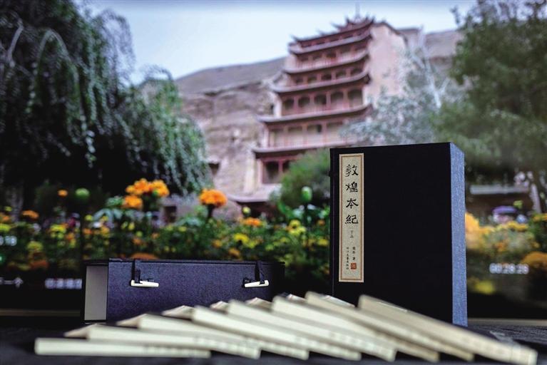 兩個(gè)月后,我如愿以償?!抖鼗捅炯o(jì)》繁體線裝本(限量版)出品,兩函,每函八冊,總計(jì)十六冊,繁體豎排,全手工裝訂。技藝之美,工序之繁,裝幀之考究,未之見過!當(dāng)我打開拿到手上時(shí)肅然起敬,自然會(huì)靜下來,恭恭敬敬翻閱,你能感受到甘肅豐富的歷史文化資源、厚重的文化積淀和波瀾壯闊的滄桑巨變。正是偉大的藝術(shù)和同樣偉大的宗教,在敦煌建筑了人類精神的輝煌莫高窟,人們生活在其中,才擁有現(xiàn)實(shí)人生意義的充實(shí)感和踏實(shí)感。