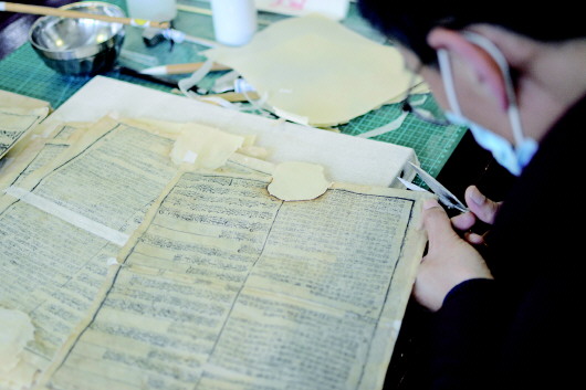 古籍部主任李東暉介紹,古籍破損的原因很多,歸納起來大致有蟲蛀鼠嚙、霉蝕、酸化、老化、使用中的磨損等。針對不同的“病因”,古籍修復(fù)師都要制訂不同的修補方案。古籍修復(fù)有兩種方法,一種是全手工修復(fù),另一種是使用紙漿補孔設(shè)備修復(fù)。全手工修復(fù)需要選擇配紙、修補破洞、壓平處理、搓紙捻釘、理齊、打眼、復(fù)原裝訂成冊等工序。紙漿補孔機修復(fù)一般適用于蟲蛀破損嚴(yán)重的古籍。面對一些破損嚴(yán)重的古籍,將粘連的古籍分頁也絕非易事,得使用“干揭”“濕揭”“蒸揭”等手法。