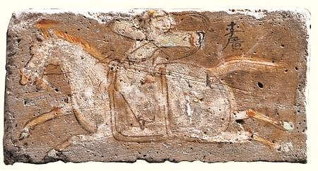 敦煌市博物館藏的西晉李廣射虎彩繪畫(huà)像磚表現(xiàn)的是“李廣射虎”的情景。李廣頭戴冠,八字須,著交領(lǐng)窄袖衣,系腰帶,下身著裈,騎于疾奔的馬上返身張弓待發(fā)。李廣射虎的故事被記載于司馬遷《史記》中,原文是:“廣出獵,見(jiàn)草中石,以為虎而射之,中石沒(méi)鏃,視之石也。因復(fù)更射之,終不能復(fù)入石矣。廣所居郡聞?dòng)谢?,嘗自射之。及居右北平射虎,虎騰傷廣,廣亦竟射殺之。”
