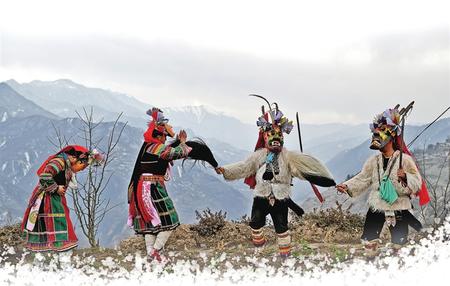 文縣鐵樓鄉(xiāng)麥貢山村,當?shù)鼐幼〉臇|亞最古老部族白馬藏族用自己獨特的民俗——跳“池哥晝”,歡度元宵佳節(jié)。