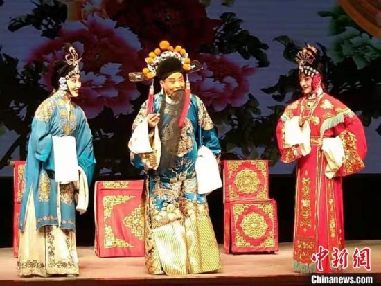 2月中旬,中新網(wǎng)記者采訪甘肅省級(jí)非遺傳承人趙希順。圖為趙希順(左二)登臺(tái)表演隴劇?!「拭C省隴劇院供圖