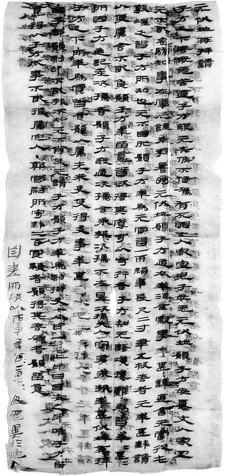 子方足下,善毋恙!苦道子方發(fā),元失候不侍駕,有死罪。丈人、家室、兒子毋恙,元伏地愿子方毋憂。丈人、家室元不敢忽驕,知事在庫(kù),元謹(jǐn)奉教。暑時(shí)元伏地愿子方適衣、幸酒食、察事,幸甚!謹(jǐn)?shù)溃簳?huì)元當(dāng)從屯敦煌,乏沓,子方所知也。元不自外,愿子方幸為元買沓一兩,絹韋,長(zhǎng)尺二寸;筆五枚,善者,元幸甚。錢請(qǐng)以便屬舍,不敢負(fù)。愿子方幸留意,沓欲得其厚、可以步行者。子方知元數(shù)煩擾,難為沓。幸甚幸甚!所因子方進(jìn)記差次孺者,愿子方發(fā)過次孺舍,求報(bào)。次孺不在,見次孺夫人容君求報(bào),幸甚,伏地再拜子方足下!所幸為買沓者,愿以屬先來吏,使得及事,幸甚。元伏地再拜再拜!
