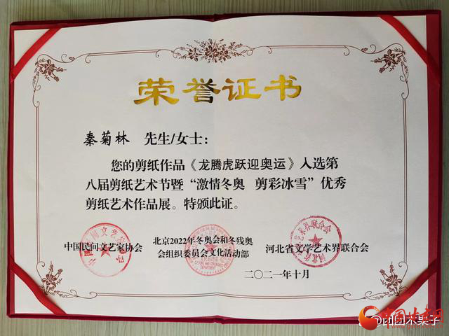 2021年11月由中國民間文藝家協(xié)會(huì)、河北省文學(xué)藝術(shù)界聯(lián)合會(huì)主辦,河北省民間文藝家協(xié)會(huì)、中共蔚縣人民政府承辦的“第八屆剪紙藝術(shù)節(jié)暨激情冬奧.剪彩冰雪”優(yōu)秀剪紙藝術(shù)大賽中,剪紙作品《龍騰虎躍迎奧運(yùn)》榮獲優(yōu)秀收藏作品同時(shí)被河北省蔚縣博物館永久收藏,并頒發(fā)收藏證書。