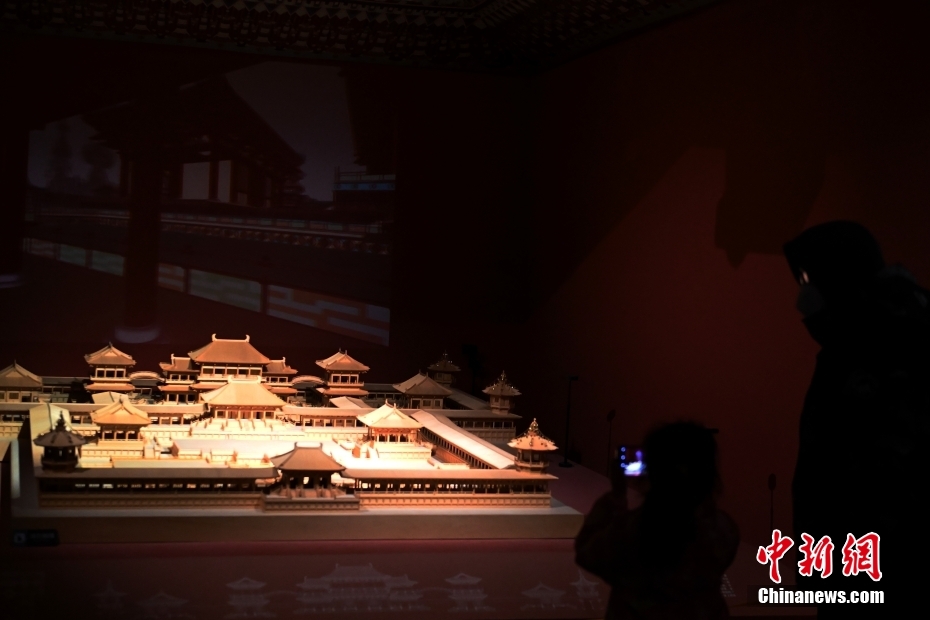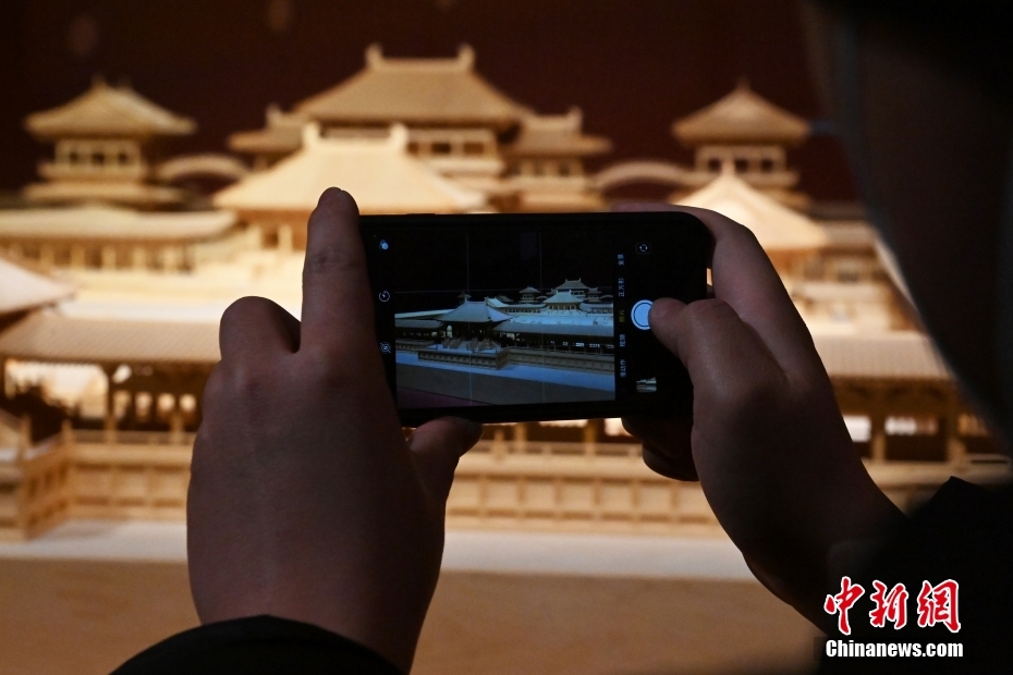 游客正在拍攝“千年?duì)I造——敦煌壁畫中的建筑之美”特展上的佛寺建筑群模型。