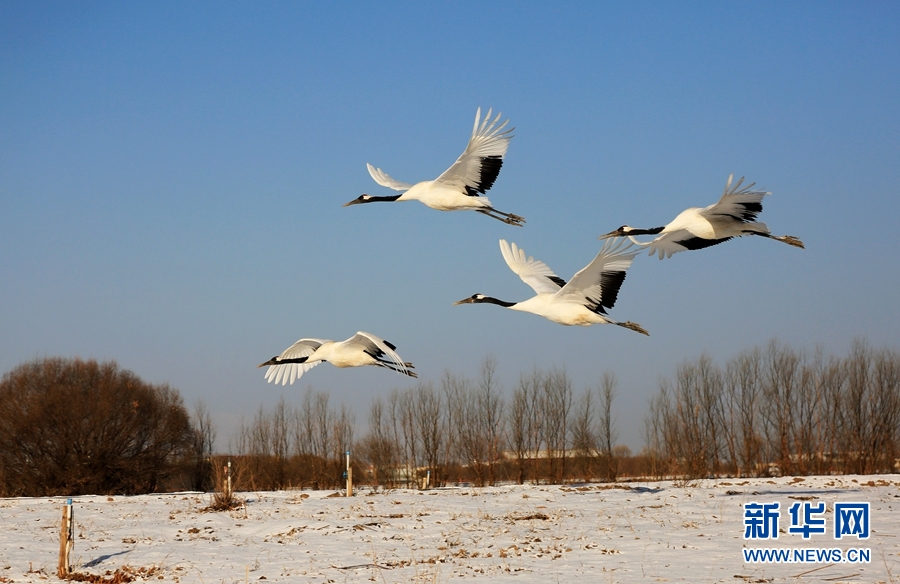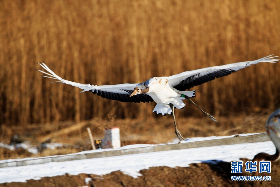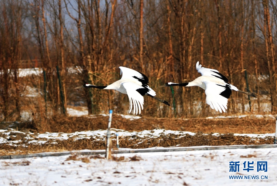 2月14日,雪后初晴,甘肅省張掖國家濕地公園放飛的十余只丹頂鶴翩翩起舞、嬉戲覓食,使雪后的濕地公園充滿生機。新華網發(fā)(陳禮 攝)