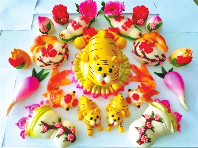 紅艷艷的牡丹花、形象各異的小動物……王霞制作的花饃不再是普通的食材,而是栩栩如生的藝術品。放在展臺最中間的一個巨型花饃格外吸睛。這個花饃用一層層面餅做底座,每一層面餅上都有牡丹、月季、百合等各種花卉競相開放,不時有蝴蝶和小鳥停留在花朵上,充滿著喜意。