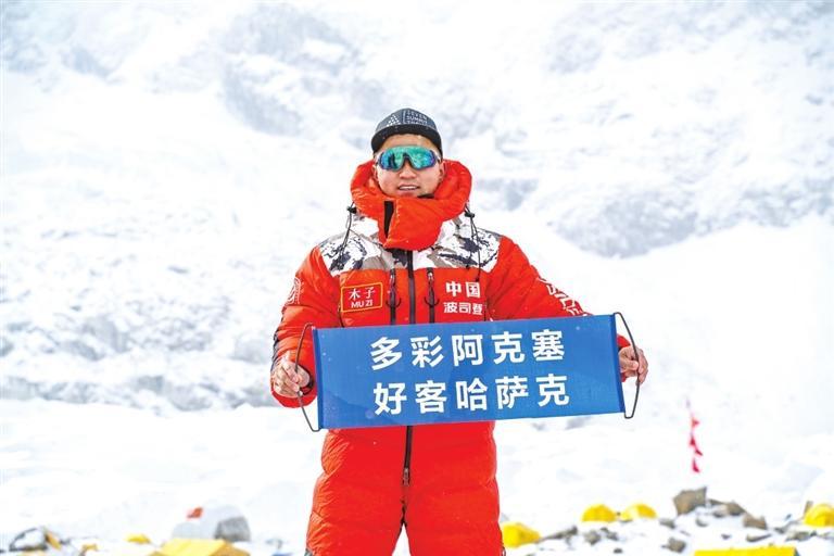 木子在珠峰展示家鄉(xiāng)廣告。