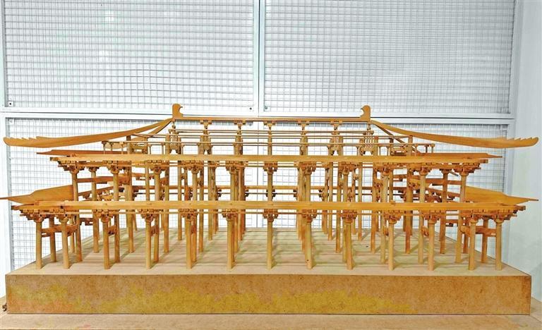 “這是兩個學生共同完成的,是按照大明宮含元殿的木制結構圖制作的。”彭維新說。