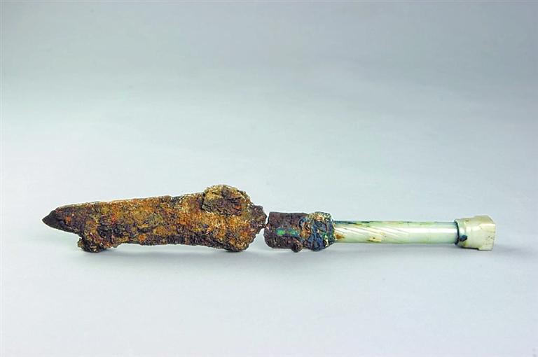 玉柄鐵劍出土于河南三門峽虢國國君虢季的墓葬,全長34.2厘米,其中劍柄長12.2厘米,劍身長22厘米。劍柄為銅芯,起到連接劍柄和劍身的作用,銅芯外鑲有晶瑩透亮的和田美玉和綠松石,并有精美的竹節(jié)飾紋,劍身和劍柄的結(jié)合處也鑲有綠松石。劍身經(jīng)由北京科技大學(xué)冶金與材料史研究所鑒定,是由塊煉法鍛制而成,劍身外有絲織品包裹的痕跡,應(yīng)當(dāng)是被絲織品包裹后放入劍鞘。劍鞘則由牛皮精制而成。這把玉柄鐵劍不僅制作精美,而且其利用玉、銅、鐵三種材料制作而成,是我國目前考古發(fā)掘出土的年代最早的人工冶鐵制品。它將我國的人工冶鐵歷史推前了近兩個世紀(jì),被專家們譽(yù)為“中華第一劍”。