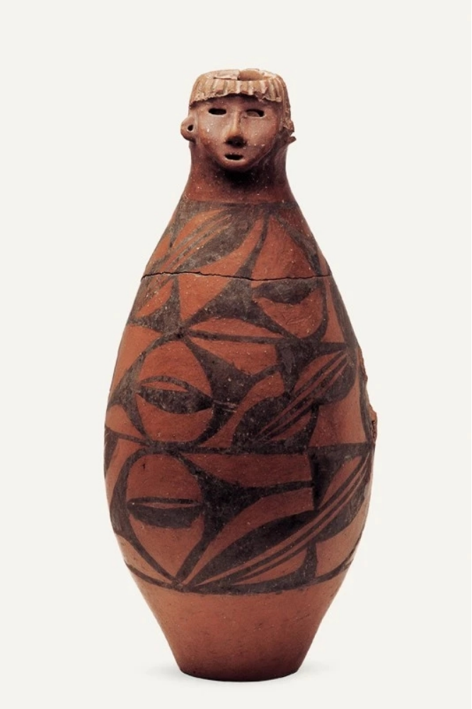 隴東少女作為甘肅的“顯眼包”之一,是曾在《國家寶藏》中出現(xiàn)過的“網(wǎng)紅”、甘肅省博物館鎮(zhèn)館之寶,它于1973年從秦安縣大地灣遺址出土。具有高度審美能力的“托尼”老師,設計了齊劉海發(fā)型,顯得很泰酷辣,圓鼓腹、平底,人們細看發(fā)現(xiàn),陶人的兩眼為圓孔洞,顯得目光深邃;鼻子呈蒜頭形,雕有鼻孔;嘴較小,微微張開,好像正在言語;兩耳外展,皆有穿孔;瓶體從上至下以黑彩飾三層大小相同、由弧線三角紋和斜線組成的二方連續(xù)圖案,以示華麗的衣物。另外,陶瓶人頭像的器口運用了不同的制作手法,頭發(fā)、嘴系雕刻而成,鼻、臉是捏塑而成。人頭像五官整齊、面龐秀麗,器身造型典雅,與人物形象渾然一體,既是大地灣文化彩陶的代表作,也是中國史前集彩繪、雕塑與造型藝術(shù)于一身的杰作。估計任誰看一眼,都會被“她”的神秘和美麗所吸引吧。