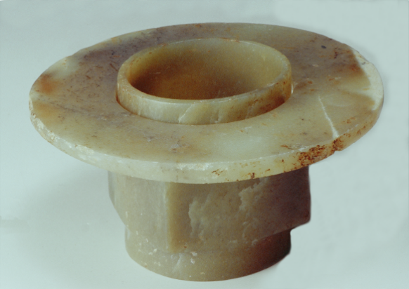這些玉器長期以來被認(rèn)為是西周器物,但從材質(zhì)到不規(guī)則的形制及雕琢工藝特征觀察,無疑是齊家文化的器物。它們雖然不能套疊使用,但可配對組合。現(xiàn)藏寶雞市鳳翔區(qū)博物館。