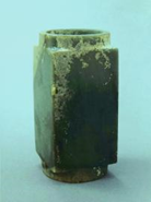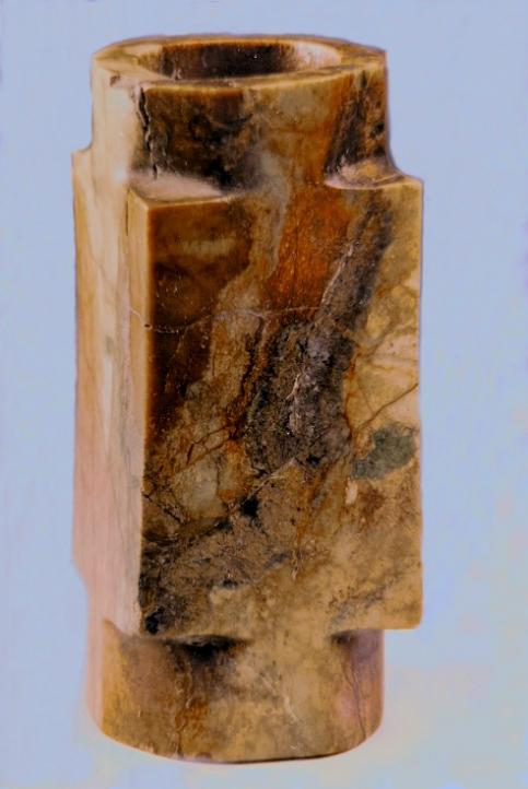 玉琮(編號總0128:1)高4~4.2厘米,外方邊長6.1~6.3厘米,內(nèi)徑5.2厘米,上端射較長,下端射極短,形制原始古樸,切割改制的現(xiàn)象明顯。