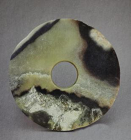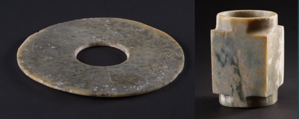 胡家底遺址發(fā)現(xiàn)的三對玉璧和玉琮,每對材質(zhì)基本相同,玉璧中孔可套疊在琮之射端,可見當(dāng)年有可能套疊使用以祭祀天地。