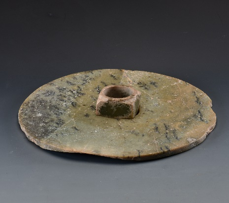 玉璧(編號總0129:5)直經(jīng)9厘米,單面鉆孔,大端孔徑4.4厘米,小端孔徑4厘米,厚度0.55—0.7厘米,璧外緣有磕碰痕。