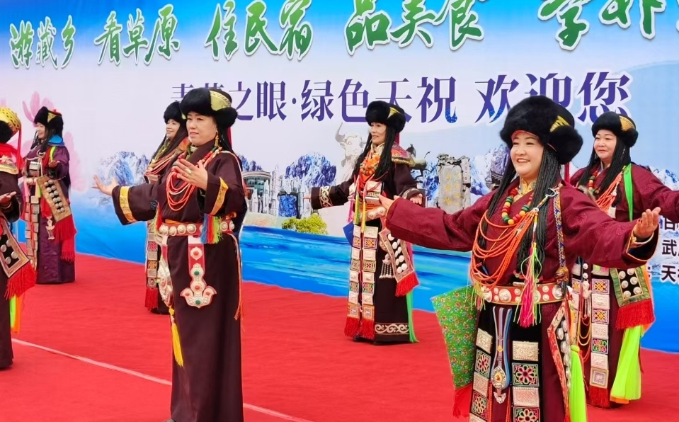 在天祝縣抓喜秀龍阿尼嘎卓帳篷城,身著藏族服飾的美麗卓瑪向采風團獻上了潔白的哈達,華銳藏歌、華銳則柔、華銳鍋莊等獨具特色的文藝演出讓現場觀眾拍手稱贊。