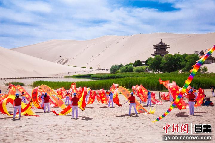 6月10日,敦煌市鳴沙山下,一場(chǎng)以敦煌市舞龍隊(duì)為首的20個(gè)健身舞蹈隊(duì)為廣大市民和游客獻(xiàn)上一臺(tái)臺(tái)精彩的舞蹈盛宴,吸引了眾多游客圍觀、拍照,在敦煌大漠度過(guò)一個(gè)難忘的端午節(jié)。王斌銀 攝