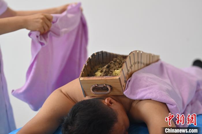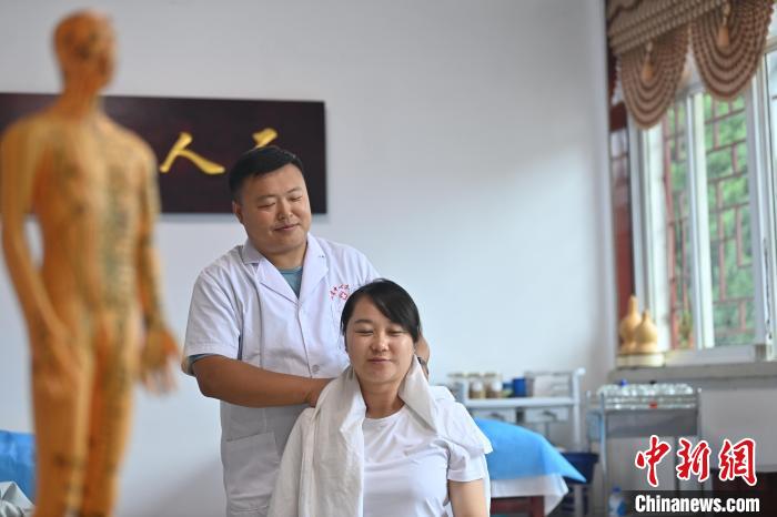 7月16日,甘肅省平?jīng)鍪徐`臺縣皇甫謐針灸康養(yǎng)館內(nèi),工作人員對患者進行推拿治療。2006年,靈臺皇甫謐針灸術(shù)入選第一批甘肅省非物質(zhì)文化遺產(chǎn)名錄。靈臺作為皇甫謐故里,當?shù)孛癖姺浅UJ可中醫(yī)康養(yǎng),針灸、拔火罐、推拿、葫蘆灸、火龍灸(督脈灸)等中醫(yī)特色療法受到了很多人的青睞,當?shù)毓俜揭餐ㄟ^舉辦大型節(jié)會等助推中醫(yī)康養(yǎng)產(chǎn)業(yè)發(fā)展。 皇甫謐是針灸醫(yī)學鼻祖,其《針灸甲乙經(jīng)》已在多個國家被廣泛傳播應(yīng)用。  中新社記者 李亞龍 攝