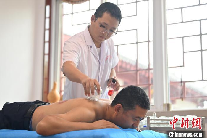 7月16日,甘肅省平?jīng)鍪徐`臺縣皇甫謐針灸康養(yǎng)館內(nèi),工作人員對患者進行拔火罐。2006年,靈臺皇甫謐針灸術(shù)入選第一批甘肅省非物質(zhì)文化遺產(chǎn)名錄。靈臺作為皇甫謐故里,當?shù)孛癖姺浅UJ可中醫(yī)康養(yǎng),針灸、拔火罐、推拿、葫蘆灸、火龍灸(督脈灸)等中醫(yī)特色療法受到了很多人的青睞,當?shù)毓俜揭餐ㄟ^舉辦大型節(jié)會等助推中醫(yī)康養(yǎng)產(chǎn)業(yè)發(fā)展。 皇甫謐是針灸醫(yī)學鼻祖,其《針灸甲乙經(jīng)》已在多個國家被廣泛傳播應(yīng)用。  中新社記者 李亞龍 攝