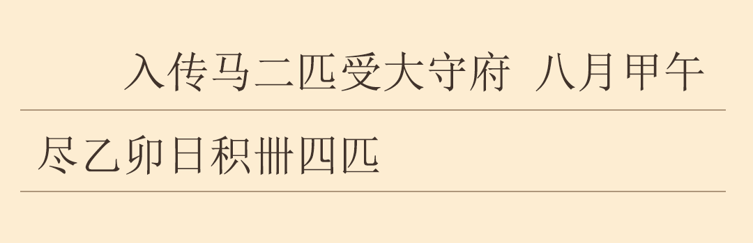 此簡性質(zhì)為懸泉置的馬匹出入簿,大意為懸泉置接收郡太守府兩匹傳馬,至八月甲午盡乙卯日,懸泉置共有馬匹44匹。簡文是對懸泉置馬匹固定資產(chǎn)的真實(shí)記錄,也是研究漢代政府機(jī)構(gòu)對資產(chǎn)管理與調(diào)撥的詳實(shí)資料。