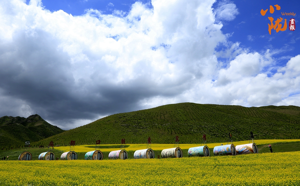 遠處,山巒高低起伏;近處,黃綠相間。金黃的油菜花和藍天、雪山、白云融合在一起,組成了別致的夏日美景,充滿了西部特有的浪漫色彩。
