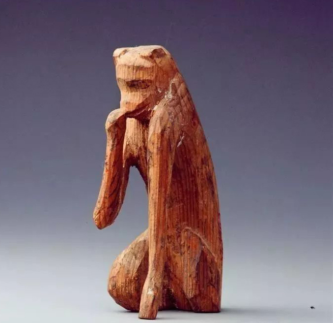 木猴,東漢,1957年甘肅武威磨嘴子出土。此猴跪坐,頭微低,左前肢垂直撐地,右前肢伸至嘴部,似在抿嘴偷笑,又似在品嘗食物。整個(gè)雕塑用黑、紅兩色彩繪,形體小巧,刀法簡(jiǎn)練,將一只調(diào)皮的猴子微感惶惑的瞬間神態(tài)刻畫(huà)入微。該作品用一塊木頭雕成,是漢代雕刻中的佳作。