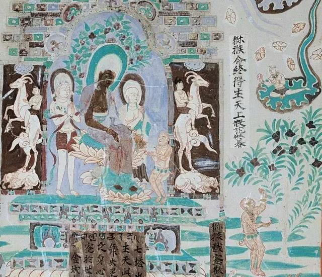 壁畫(huà)畫(huà)面右側(cè)有一飛天正在散花,云端之下是一棵茂盛的大樹(shù),一只猴子正仰著頭,一手舉起做采摘狀。其旁側(cè)有白底墨書(shū)題記寫(xiě)著“獼猴命終得生天上散花供養(yǎng)”。畫(huà)面右側(cè)一佛坐蓮花座之上,兩旁一弟子一菩薩協(xié)侍左右,一只猴子雙手捧一缽,虔誠(chéng)地供養(yǎng)佛。