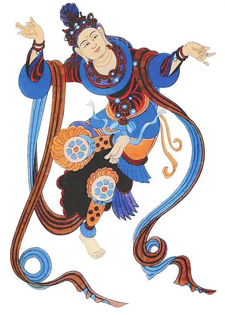 敦煌莫高窟,窟窟有壁畫,拼接起來(lái)長(zhǎng)達(dá)45000多平方米,有世界上“最大畫廊”之稱。這些壁畫中,幾乎每幅都有舞蹈形象,如在窟頂、龕楣、藻井遨游的飛天,憑欄上的天宮伎樂,經(jīng)變畫中的娛佛、敬佛的獻(xiàn)舞者——伎樂天,出行圖中跳著具有濃郁生活氣息的世俗樂舞,以及富有舞蹈美感的彩塑菩薩、天王力士等,琳瑯滿目,精妙絕倫。這些舞蹈形象充分反映了從十六國(guó)北朝至元代千余年來(lái)不同歷史時(shí)期的舞蹈服飾、形態(tài)、風(fēng)貌,為我們挖掘、整理、弘揚(yáng)中華民族舞蹈文化提供了十分珍貴的形象資料。
