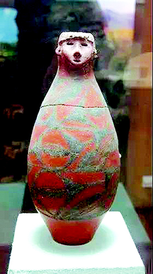 這件距今約6000年的文物,高31.8厘米,口徑4.5厘米,底徑6.8厘米,被許多人稱(chēng)之為半神半人彩陶瓶。瓶為細(xì)泥紅陶質(zhì)地,腹部以上施陶衣。器型為兩頭尖的圓柱體,下腹內(nèi)收。瓶器口為圓雕人頭像,披發(fā),堪稱(chēng)遠(yuǎn)古時(shí)期的雕塑杰作。