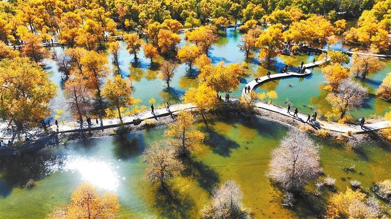 10月2日,游客在金塔沙漠胡楊林景區(qū)欣賞胡楊美景。新甘肅·甘肅日報通訊員 曹紅祖