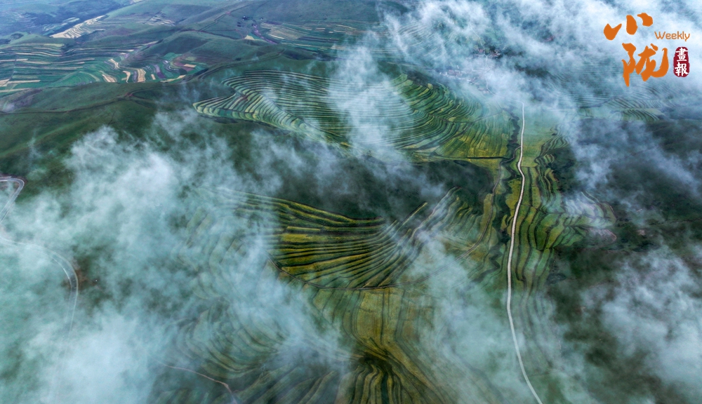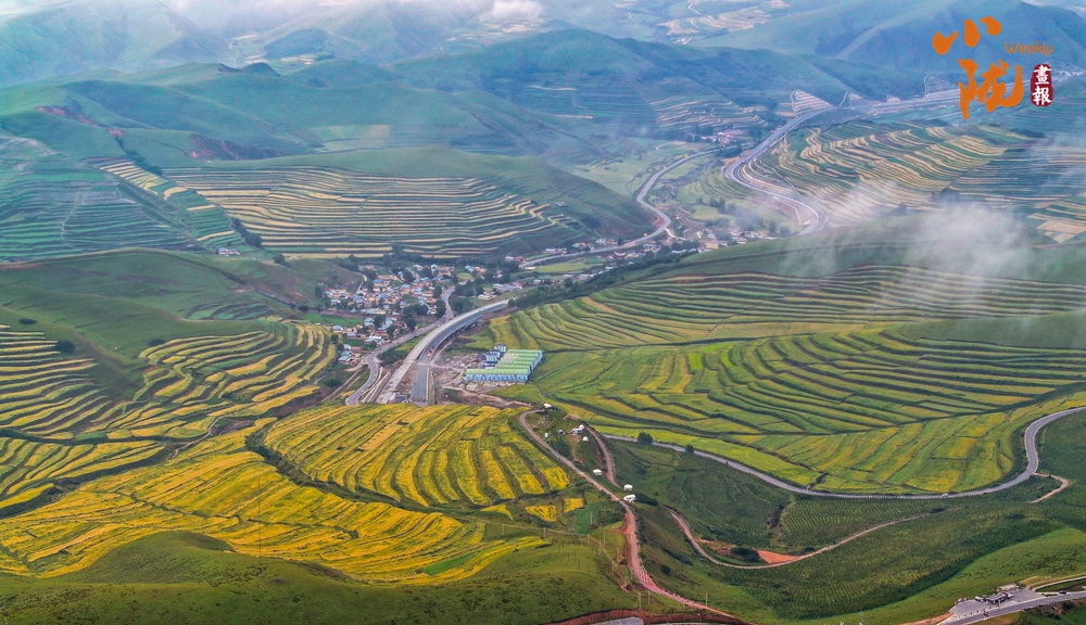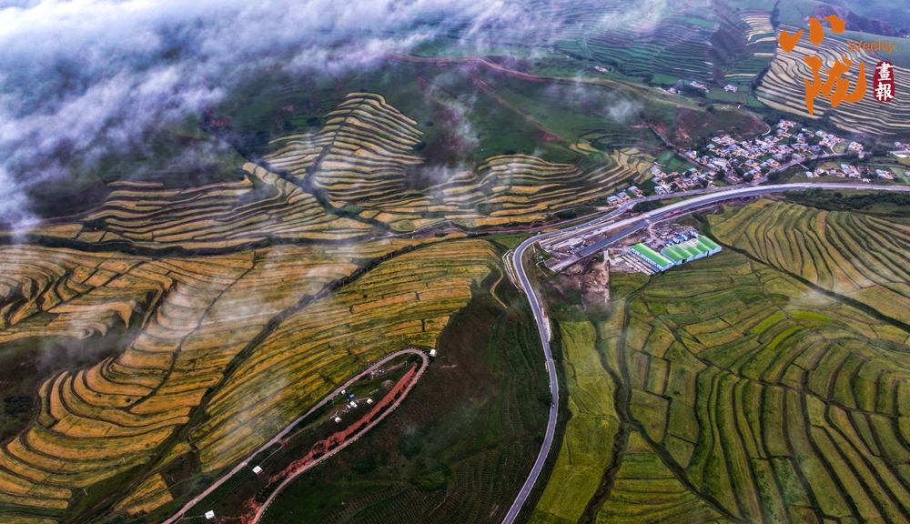 一場(chǎng)秋雨過后,甘南臨潭連綿的群山被云霧籠罩,星羅棋布的梯田上迎來收獲期,稻浪滾滾,美不勝收。