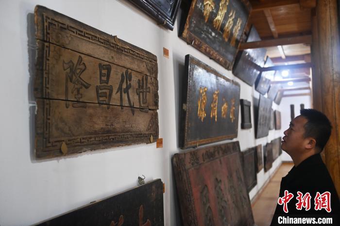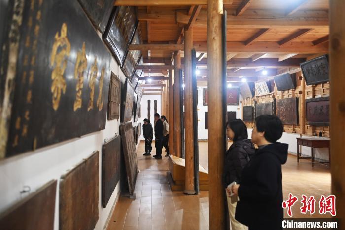 10月23日,甘肅省天水市秦安縣明清街秦安匾額博物館,游人參觀當(dāng)?shù)厥詹氐呢翌~。中新社記者 李亞龍 攝