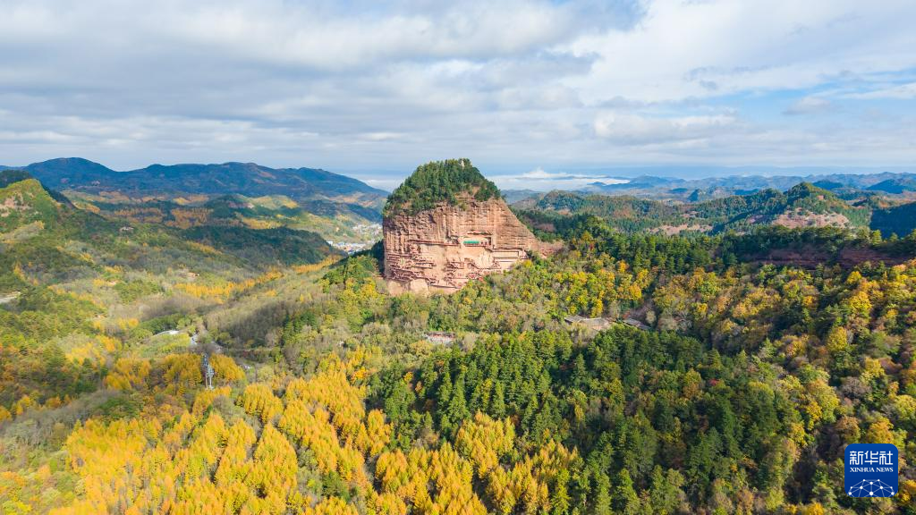 這是11月2日拍攝的麥積山石窟秋景(無(wú)人機(jī)照片)。新華社記者 陳斌 攝
