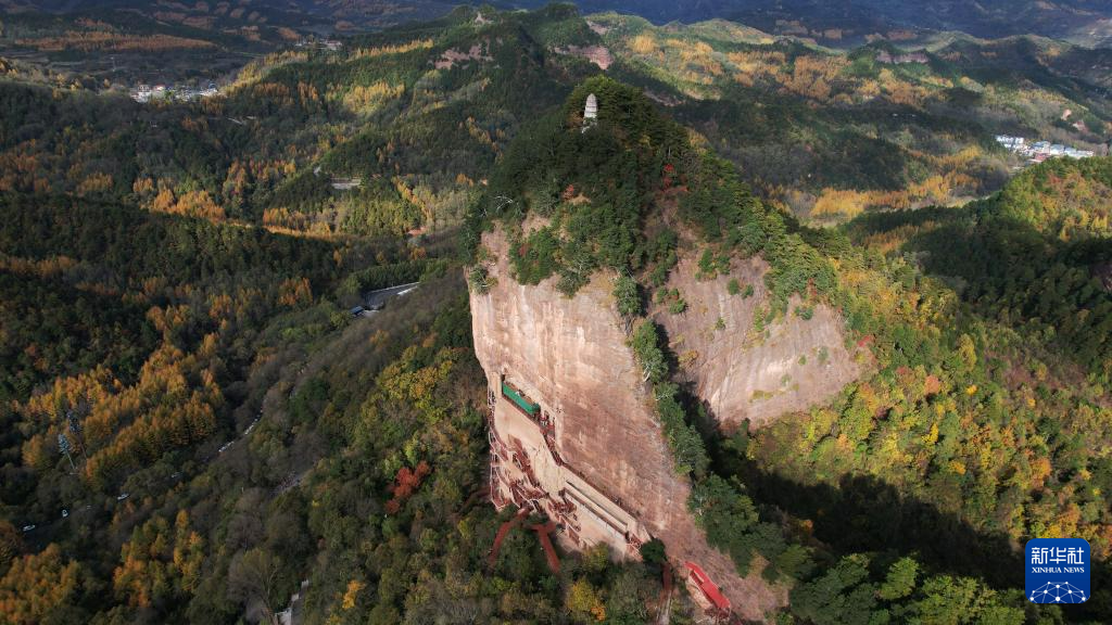 這是11月2日拍攝的麥積山石窟秋景(無(wú)人機(jī)照片)。新華社記者 郎兵兵 攝