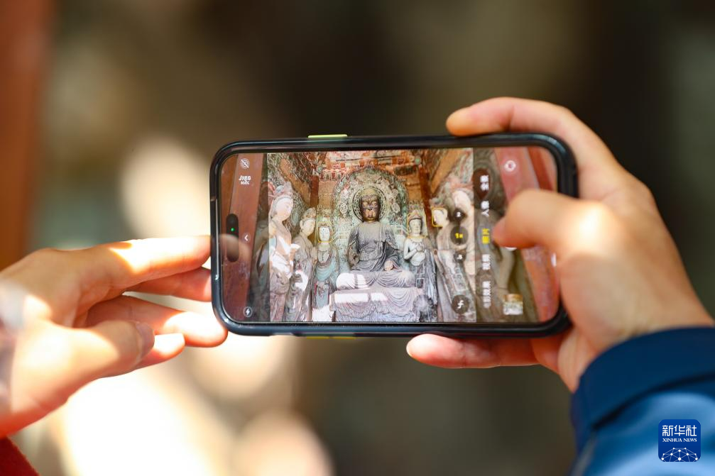 11月2日,游客在麥積山石窟參觀游覽時(shí)用手機(jī)拍攝開(kāi)放洞窟彩塑。新華社記者 郎兵兵 攝