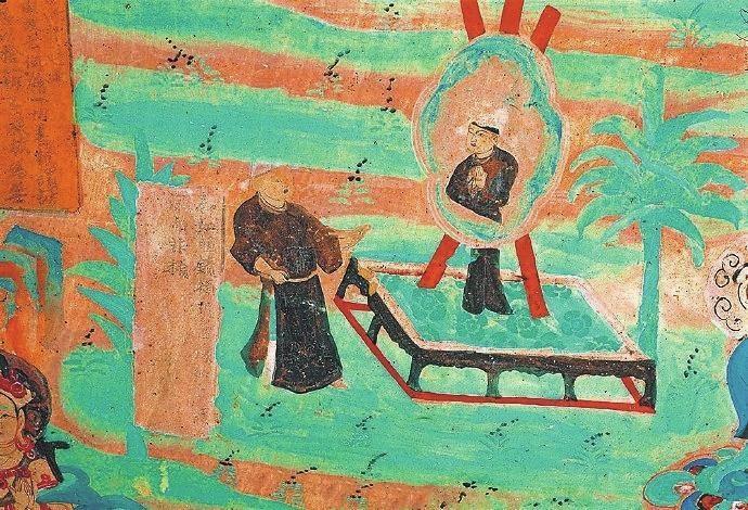 戰(zhàn)國時期楚國詩人屈原在《漁父》一文中寫道:“吾聞之,新沐者必彈冠,新浴者必振衣。安能以身之察察,受物之汶汶者乎?”意思是說我聽說剛洗過頭的人一定會去彈彈帽子上的灰塵;剛洗過澡的人一定要抖抖衣服的灰塵。怎能讓清白的身體去接觸世俗塵埃的污染呢?當年的敦煌人走出溫泉,在身心放松之后,就該靜觀返照自己了。在莫高窟第85窟中有一幅“曲花式鏡圖”:畫面上在一個正方形鏤空的底座上擺放著一個巨大的曲花式鏡,鏡子式樣別致,明亮澄澈。藍色的曲花式樣引人矚目。但畫面上最吸睛的是一位魁梧俊朗身著一襲赭色長袍的男子,他正在鏡子前仔細地打量自己,而鏡中映射出他神情凝重的情態(tài)來。原來,古人照鏡除了正衣冠之外,還有反觀自照的含義,在鏡子前良久地注視自己,就是對自己反省、頓悟的過程。“一年好景君須記”,走過四季,到了歲末,該是每個人回望來時路,展望前方的時候了。