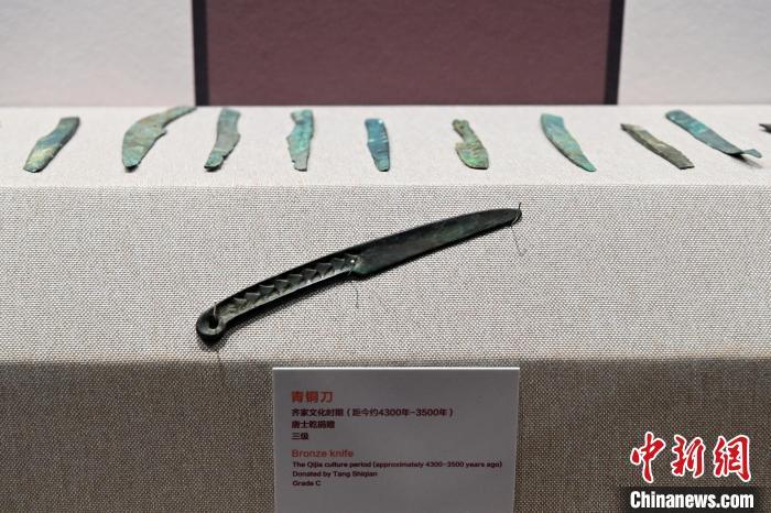 11月27日,甘肅省臨夏州廣河縣齊家文化博物館展出的青銅刀?!【琶赖┰?nbsp;攝