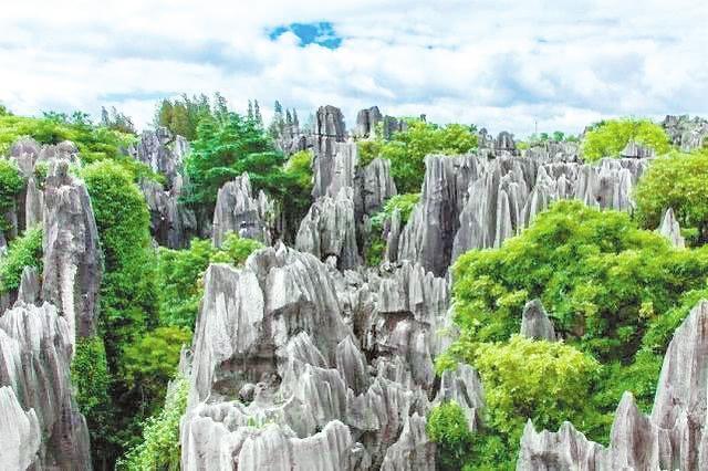 石林以高大、密集的石灰?guī)r溶柱呈森林狀分布而得名,是喀斯特術(shù)語“石林”的發(fā)源地。除典型的劍狀、柱狀、蘑菇狀、塔狀,還有許多不規(guī)則狀的石林,幾乎匯集了世界上所有類似的石林地貌形態(tài),被譽為“石林喀斯特博物館”。