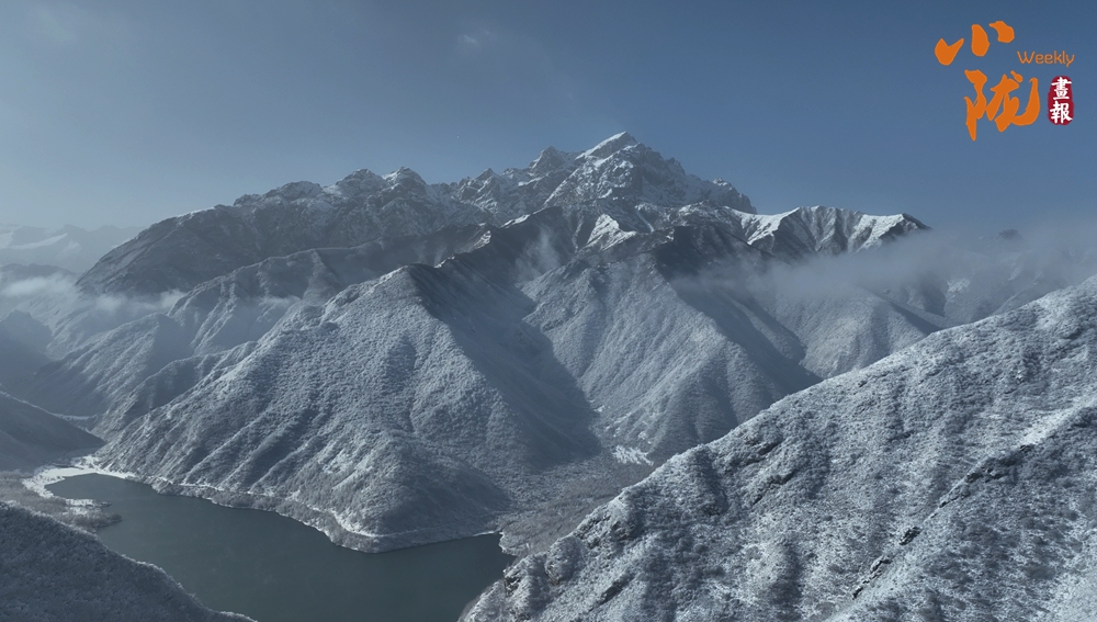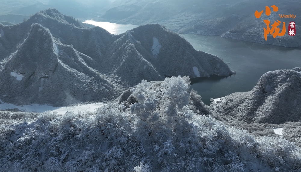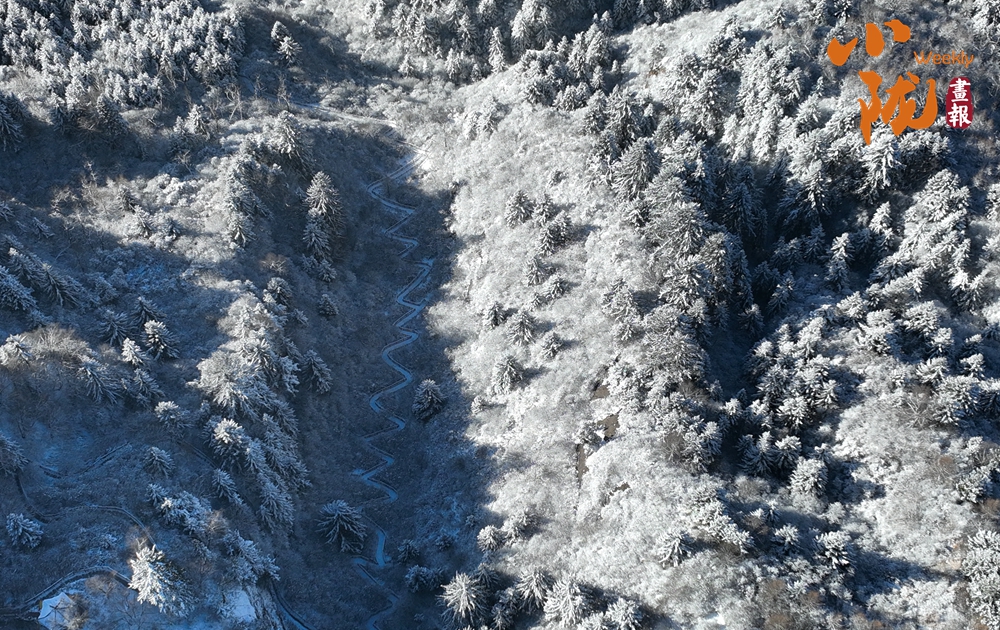 云霧繚繞中,太子山主峰巍峨壯觀(guān),翠色與白雪交織,綿延起伏的山巒溝壑被銀裝緊緊包裹,閃爍著迷人的光芒。