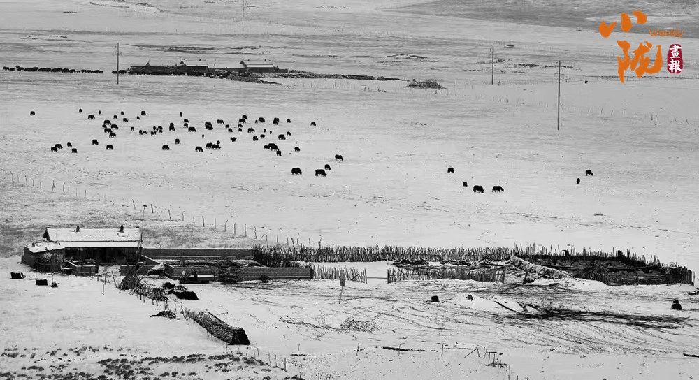 天空陰沉,雪花依舊飄落,分散在雪地中的牦牛群,悠然自得地啃食著牧草,寒冷的天氣仿佛對(duì)它們毫無(wú)影響。