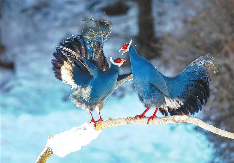 藍(lán)馬雞是珍稀名貴的禽類,頭側(cè)緋紅,耳羽簇白色、突出于頸部頂上,通體藍(lán)灰色,中央尾羽特長(zhǎng)而翹起,尾羽披散下垂如馬尾,故名藍(lán)馬雞。冬日里,藍(lán)馬雞成群飛落山腳覓食,藍(lán)羽丹頂行走在雪地上格外搶眼。數(shù)量繁多的藍(lán)馬雞是祁連山野生山地雞的“顏值擔(dān)當(dāng)”。覓食時(shí),藍(lán)馬雞常用爪刨挖林中空地苔蘚和林緣草地,尋找掉落的云杉種子。刨食的過程會(huì)讓土壤松動(dòng),便于種子生根發(fā)芽,促進(jìn)林區(qū)植物天然更新。