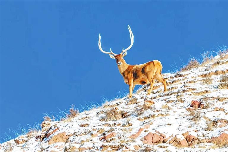 雪豹皮毛呈灰白色,有黑色點(diǎn)斑和黑環(huán),在巖石堆中是極好的保護(hù)色。雪豹行蹤神秘,以往人們只有通過雪地上的梅花掌印確定它的足跡。近年來,隨著祁連山生態(tài)環(huán)境的持續(xù)好轉(zhuǎn),保護(hù)區(qū)已經(jīng)成為雪豹、白唇鹿等珍稀動(dòng)物繁衍生息的樂土。作為高原生態(tài)食物鏈頂端的食肉動(dòng)物,雪豹對(duì)維持祁連山生態(tài)系統(tǒng)的穩(wěn)定與健康至關(guān)重要。