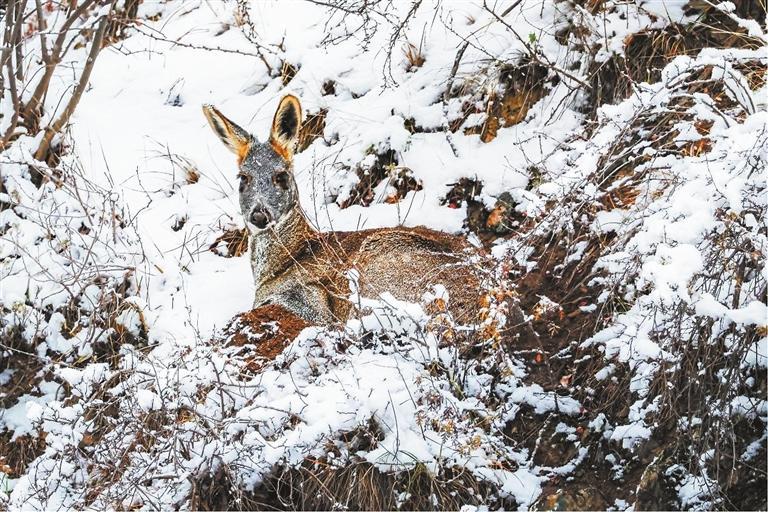攝影師鏡頭下,一只馬麝安然臥在雪地上,它的耳朵偶爾會(huì)輕輕抖動(dòng)一下,像是在用心傾聽著風(fēng)中傳來的細(xì)微聲響。它優(yōu)美的身形與周圍的景色完美融合在一起,寧?kù)o而祥和。