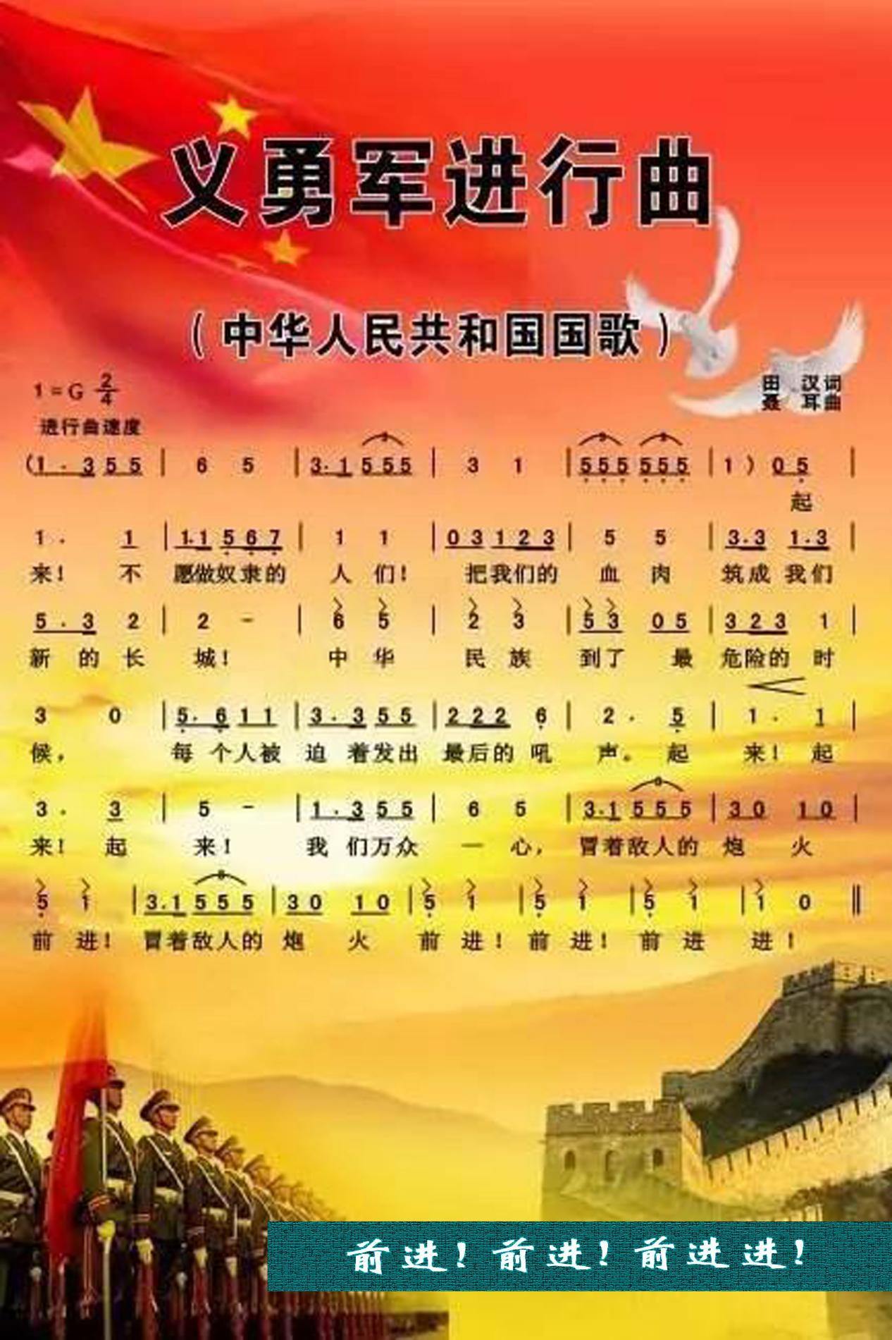 ?、嗲斑M!前進!前進進?。骸读x勇軍進行曲》這一段歌詞是作曲家聶耳改定的。為了使歌曲曲調和節(jié)奏更加有力,聶耳把田漢原來的“我們萬眾一心,冒著敵人的飛機大炮前進。前進!前進!前進!”改為“我們萬眾一心,冒著敵人的炮火,前進!冒著敵人的炮火,前進!前進!前進進!”全國政協(xié)委員、國家一級指揮、解放軍軍樂團前團長于海曾談到:“前進,前進,前進進!”這七個字堪稱國歌的點睛之筆。“前進進”的節(jié)奏感,凸顯了國歌精神的進行時態(tài)。正是這種精神一直在指引我們,激勵著我們。