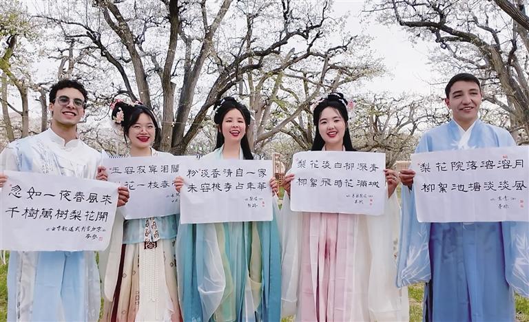 在接下來的詩詞互動環(huán)節(jié),外籍留學生開啟換裝模式,身著漢服,徜徉在梨花樹下,吟誦著“梨花”主題的詩句,感受中國漢服之美和中國傳統(tǒng)文化的魅力。換裝后的外籍留學生也讓梨園秒變“出片現(xiàn)場”。“這是我第一次穿漢服,穿著漢服在梨園里拍的照片真的很好看。”來自越南的黃青草,迫不及待地想把這份梨園的浪漫春日記憶分享給自己的同學、朋友。