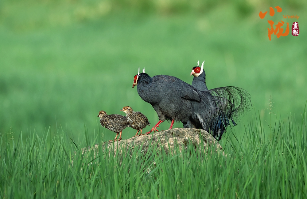 珍貴稀有的國家二級(jí)重點(diǎn)保護(hù)動(dòng)物藍(lán)馬雞,體型較大,通體藍(lán)灰色,頸項(xiàng)和肩部顏色更深,閃爍著金屬般的輝亮。其尾羽特別長,由灰藍(lán)色漸變?yōu)榘底纤{(lán)色,并渲染著金屬綠和金屬紫藍(lán)色,24枚尾羽中,中央一對(duì)尾羽特別長,富有彈性,彎曲成一個(gè)美麗的弧形,高高地翹在其他尾羽之上,披散下垂如馬尾,因而得名。此外,藍(lán)馬雞的頭側(cè)緋紅,耳羽簇白色并突出于頸部頂上,為其增添了獨(dú)特的魅力。