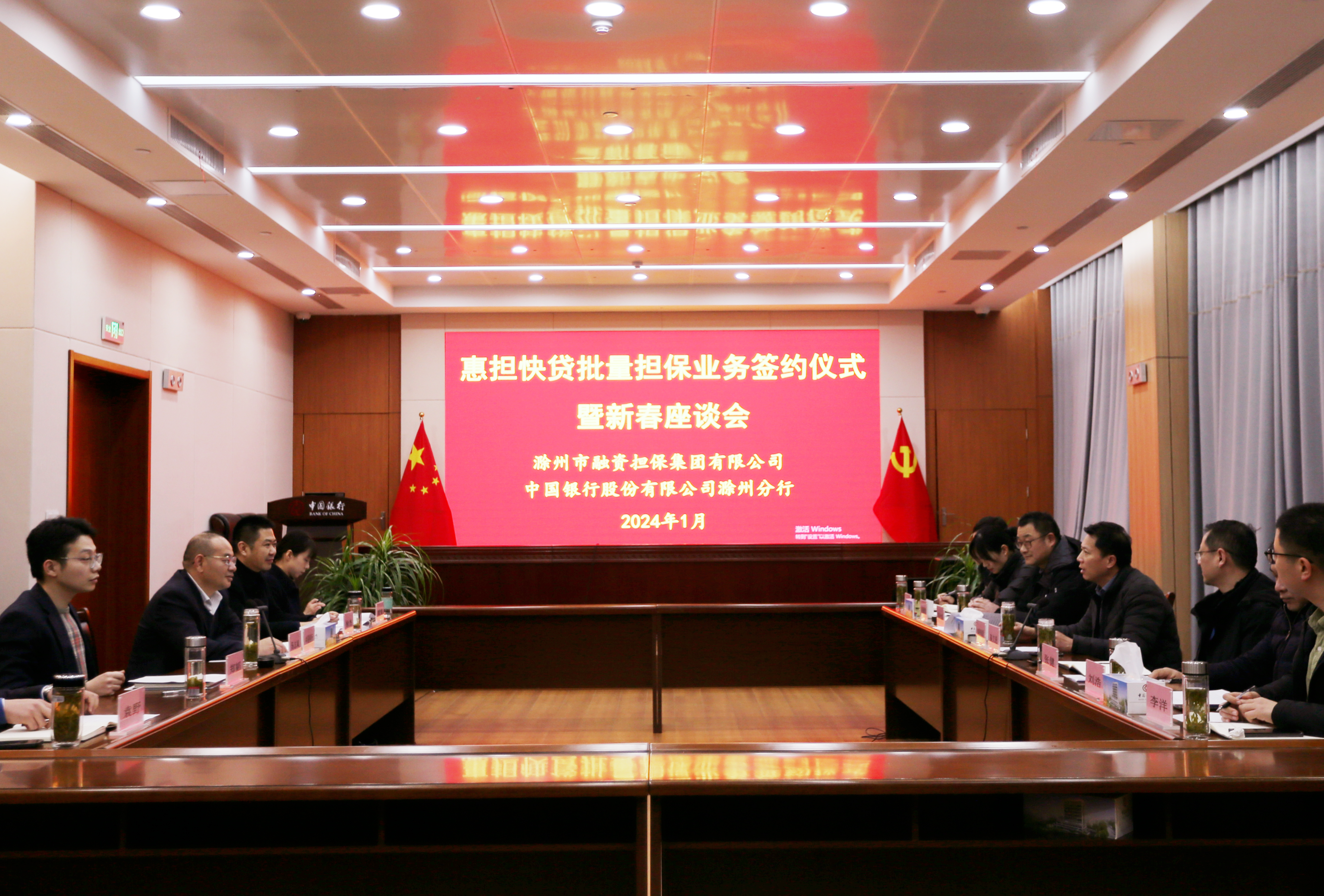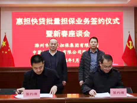 1月18日下午,滁州市融資擔保集團有限公司與中國銀行滁州分行舉行“惠擔快貸”批量擔保業(yè)務(wù)簽約儀式暨新春座談會。市擔保集團黨委書記、董事長、總經(jīng)理高文進,中國銀行滁州分行黨委書記、行長湯志斌出席簽約儀式,雙方業(yè)務(wù)部門負責人以及企業(yè)代表參加。集團黨委委員、副總經(jīng)理張健與市中行黨委委員、副行長徐杰代表雙方簽署合作協(xié)議。
