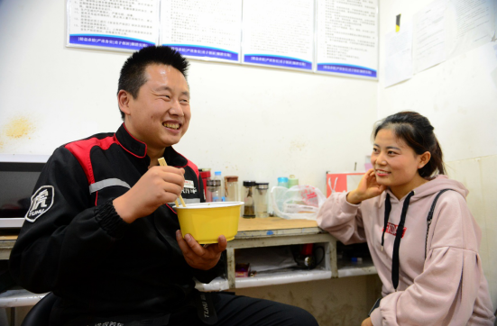 “還是老婆做的飯菜好吃,外賣真吃不成!”在門店內(nèi),范宗英接待完客戶,吃到了愛人親手做的飯菜,一邊聊著家常,一邊還不忘笑嘻嘻地貧嘴。